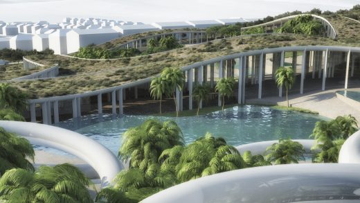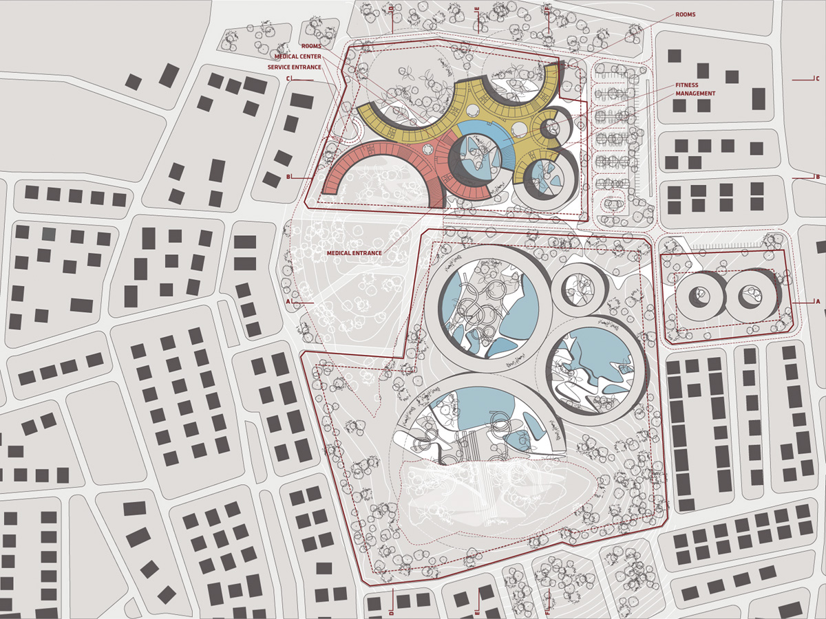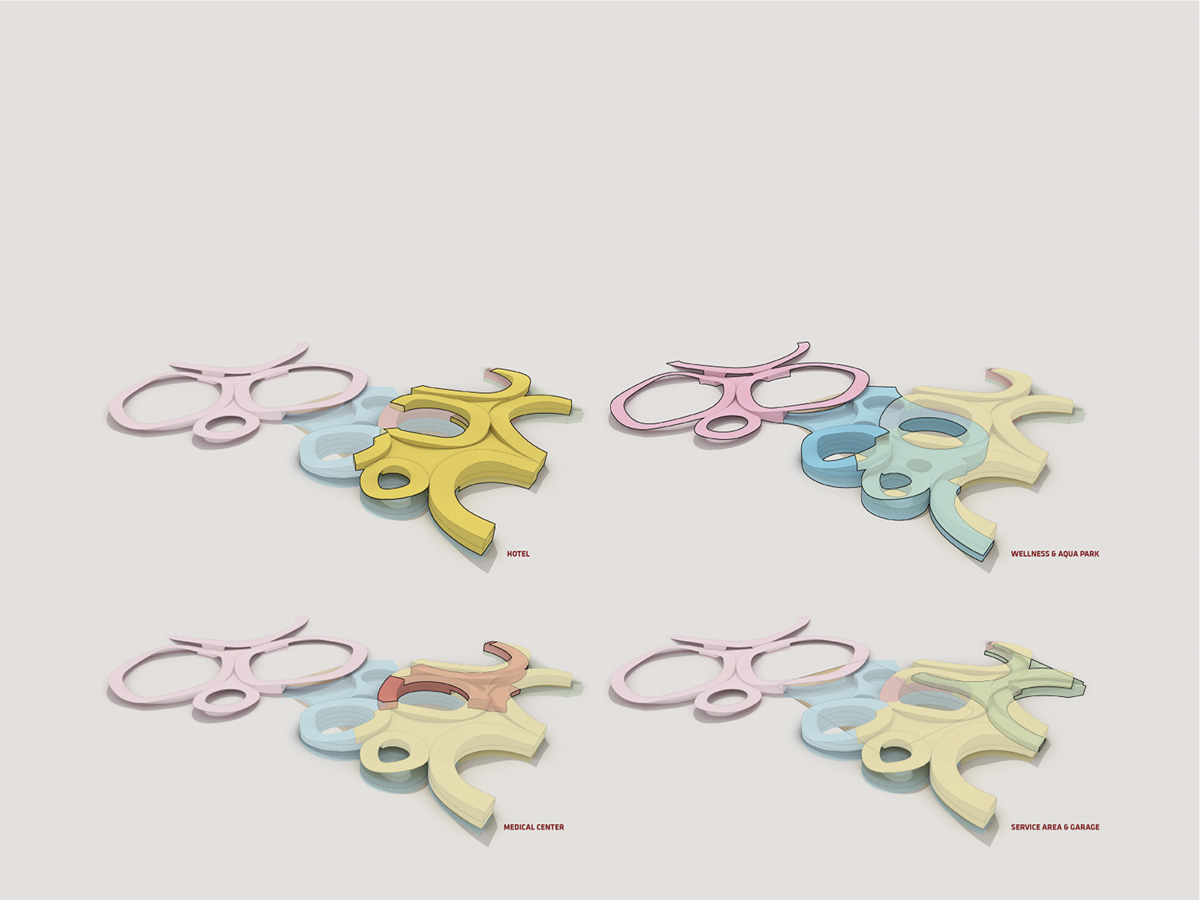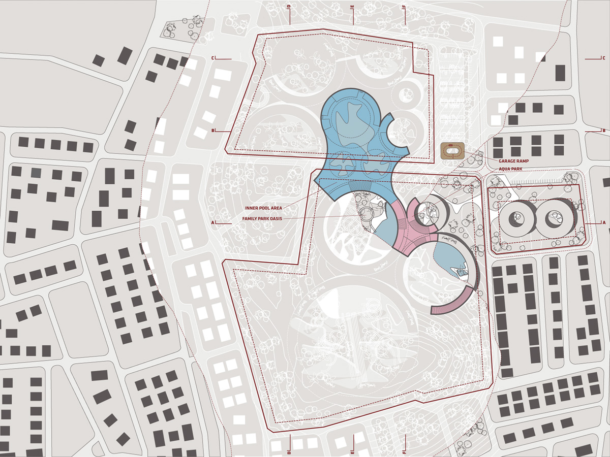 Tetusa Oasis Thermal Resort is an extensive wellness and medical facility set in the midst of low-rise housing area in coastal town Cesme in Turkey. In this well known leisure town with a long history of thermal water exploitation the decision was made to enrich the town’s offer with new central thermal complex including spa, water park, hotel, medical prevention center, elderly care facility and some other supporting programs.
