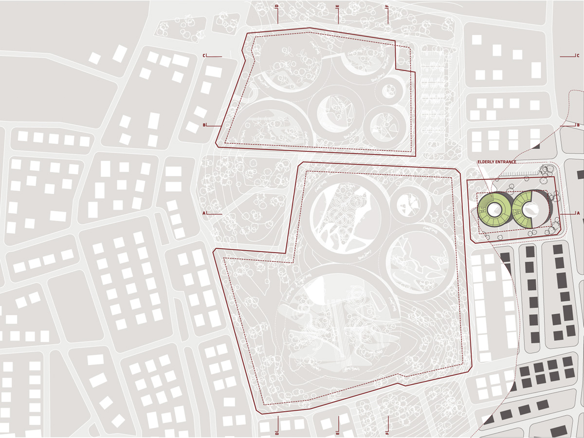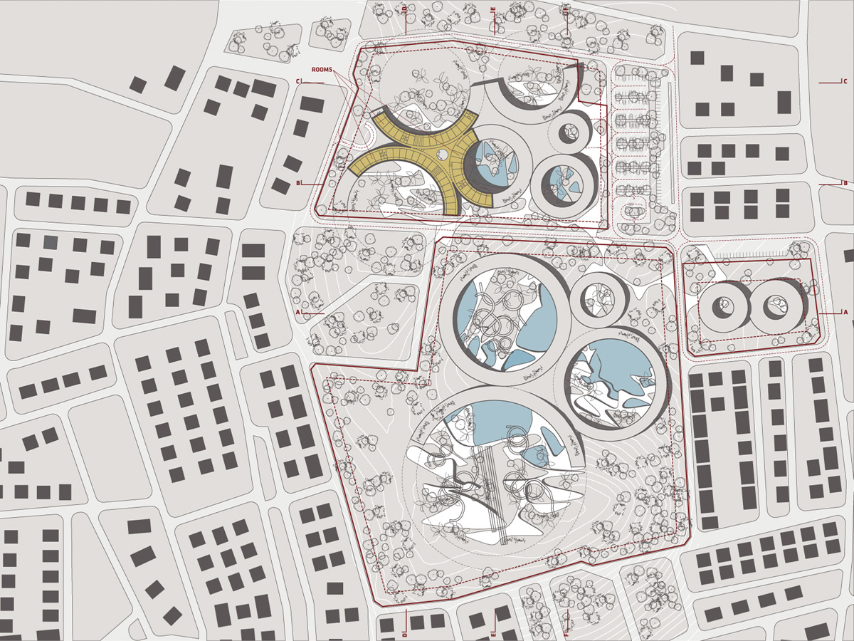 First glance at urban regulations for location in question reveals that the square footage needed for the program considerably exceeds the footage that can be placed above the ground. We found the solution in special design feature. The entire program is organized in circular building blocks wrapping around an inner atrium. The inner side of atrium is then deepened allowing sunlight to come to underground levels. The same principle is also applied to semi circular parts of building on outer side where the surrounding terrain is used to hide the view on extra levels.