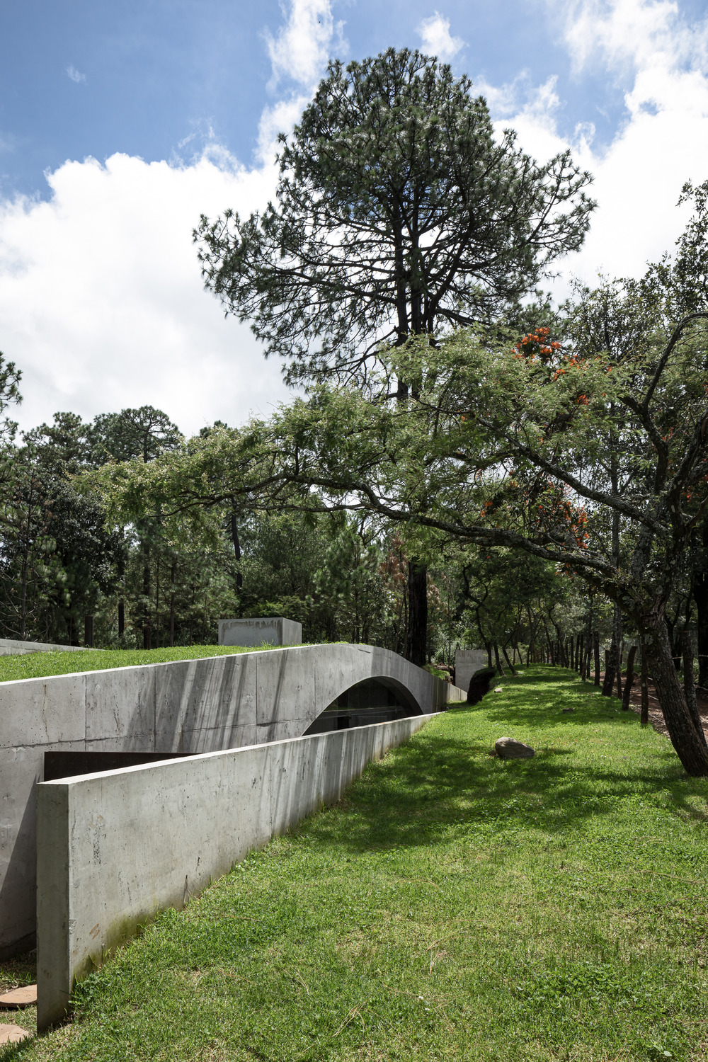 Four concrete walls contribute accents to the poem, surprisingly emerging from the landscape; two of them bearing the land of the new hill created by raising the bed sheet, and two others framing the access as they escort guests into the house.