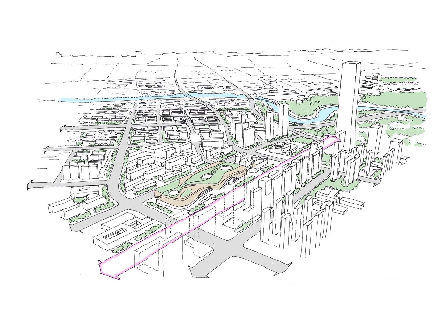 The initial scheme envisions three interconnecting buildings linked by a sunken street, incorporating office, retail, and cultural spaces. Adjacent to a Chinese history museum on one side and a shopping mall on the other, this mixed use project will run parallel to the remaining runway, which has been kept in its original form as a historic feature.