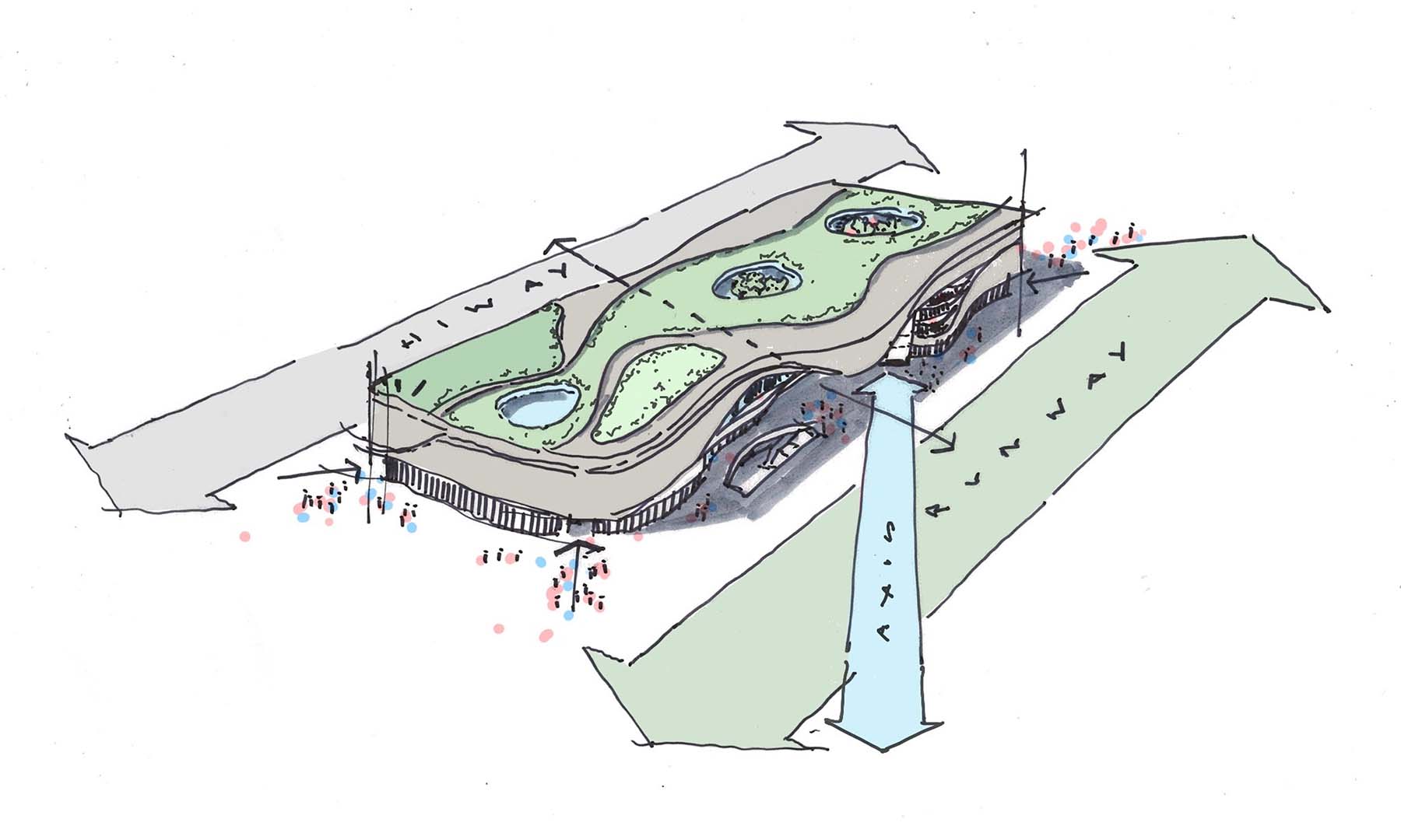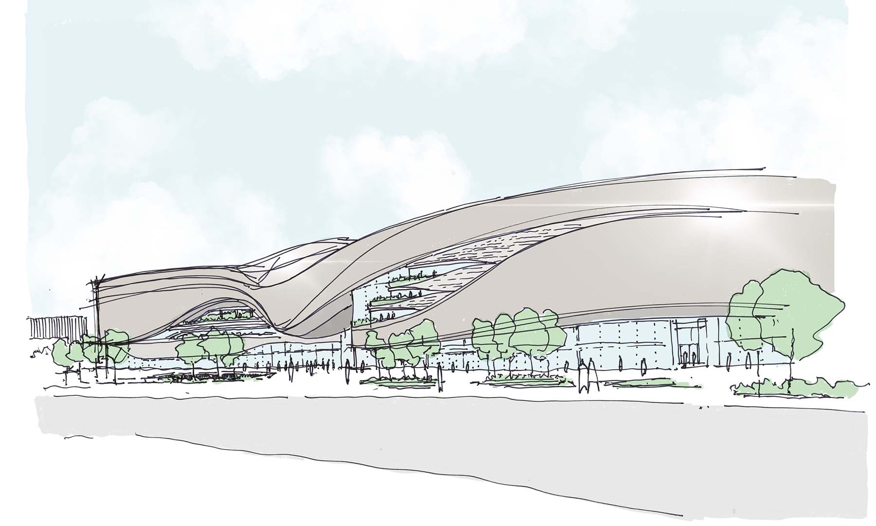 The initial scheme also promotes sustainable initiatives, featuring a water plaza which collects water, a solar energy production area on the roof which generates energy to cool the building during the summer and a green environment so that plants can introduce purified air.