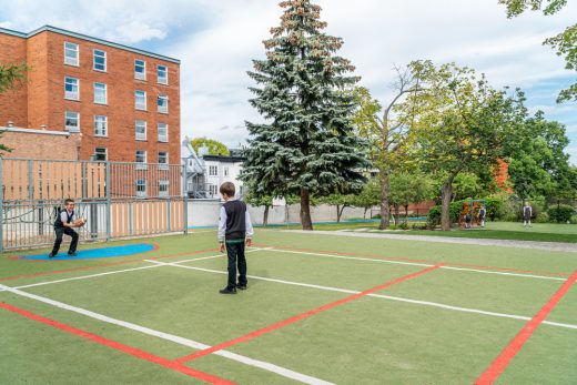 Outdoor activity has a considerable positive impact on students’ academic performance and well-being. With this in mind, the design included a variety of spaces for sports activities, relaxation, and socialization. In addition to the synthetic soccer surface, a variety of recreational and sports facilities were added including turnstile games, ball games and multisport surfaces. Stone steps follow and structure the natural slope of the field, providing a space conducive to outdoor educational activities. The variety of activities encourages students to actively appropriate the spaces while ensuring their comfort and safety. It is now possible for students to run circling the heritage orchard, or climb ropes that bring them closer to the copper roofs of adjacent buildings, making their play and laughter an integral part of the richness of this exceptional site.