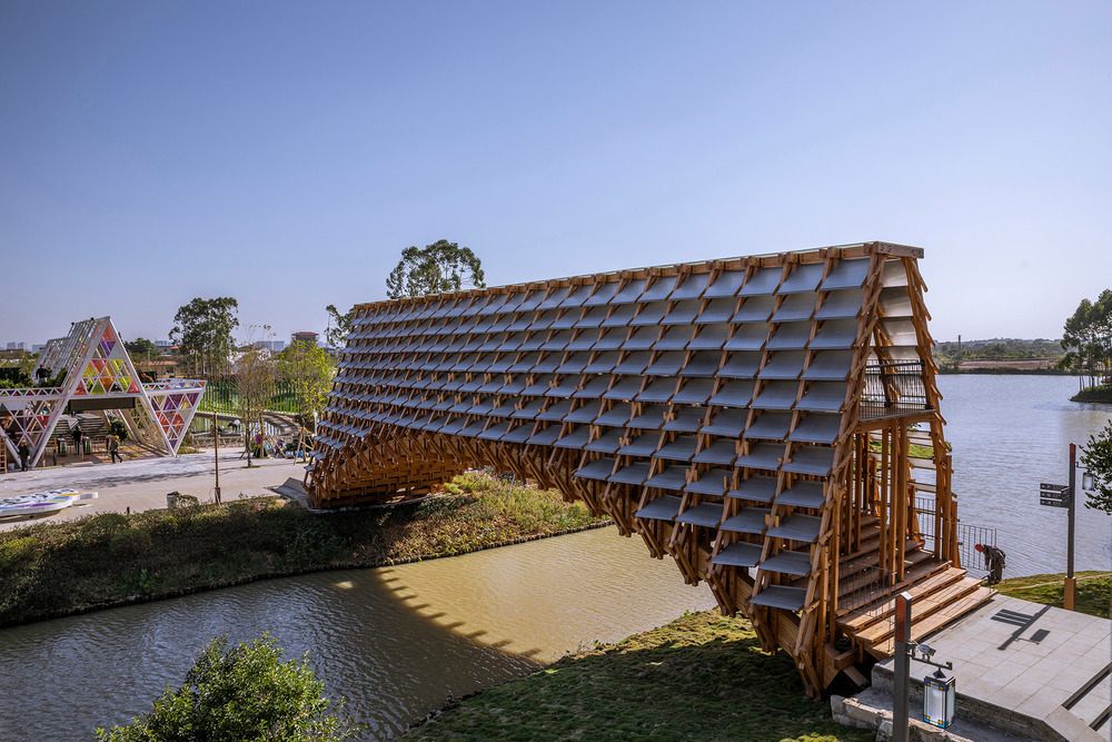The west area of the Pearl River Delta, where the timber bridge is located, has abundant rainfall, so the corridor was constructed in a relatively closed form. The exterior of the corridor space is covered by layers of metal plates, which effectively protect it from rain and create a sense of cohesion for the space.