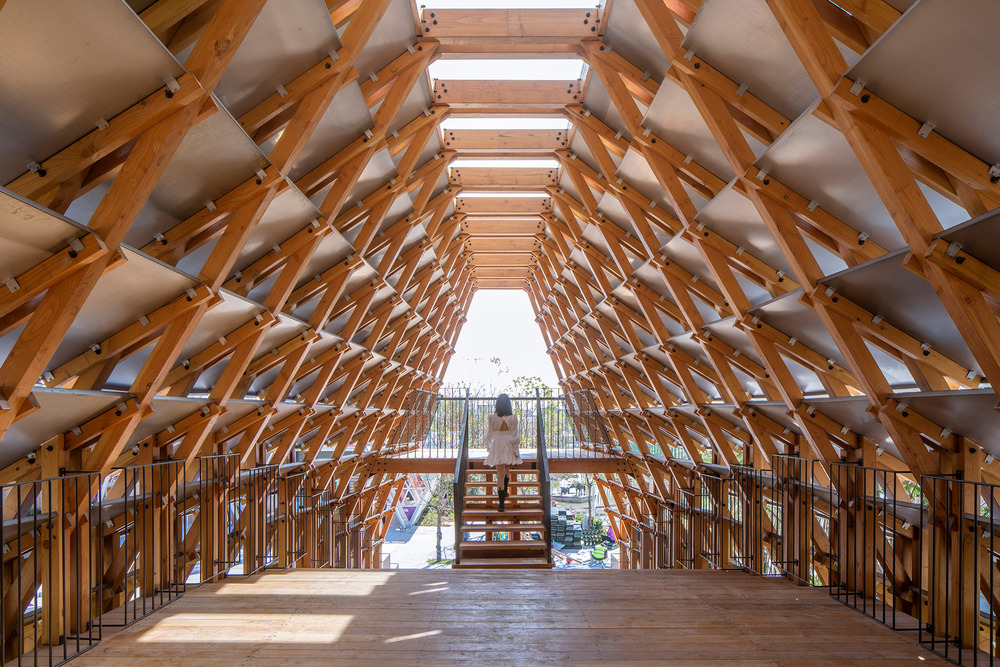 The ridge is located in the joint area between a dense traditional commercial street and a children’s recreation zone. LUO studio created a relatively “closed” corridor space on the timber bridge, which is different from other open landscape bridges in the resort. The goal was to accentuate the transition from the “practical” commercial street area to the relatively “dreamy” children’s recreation area, allowing visitors to experience a sort of ceremonial moving process.