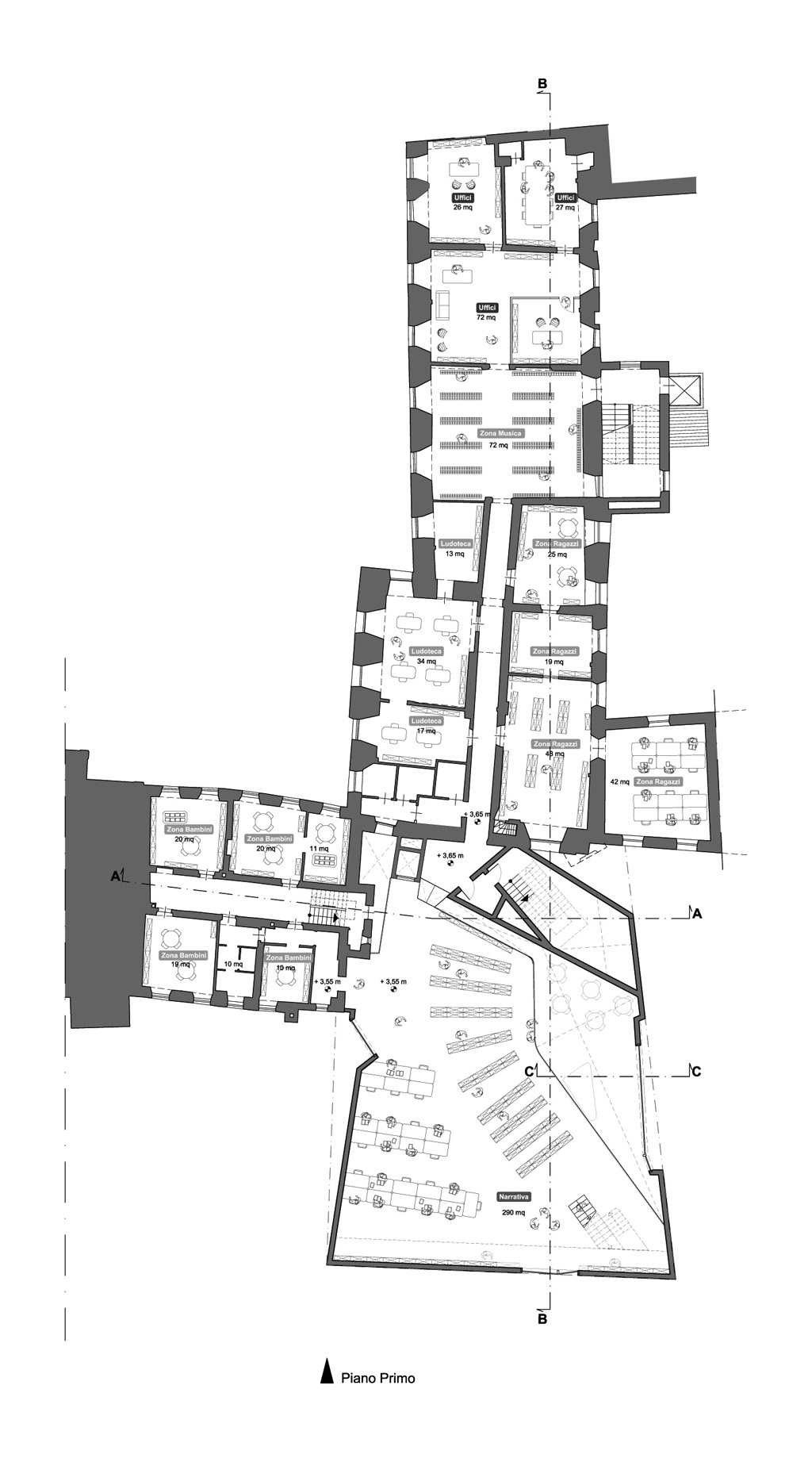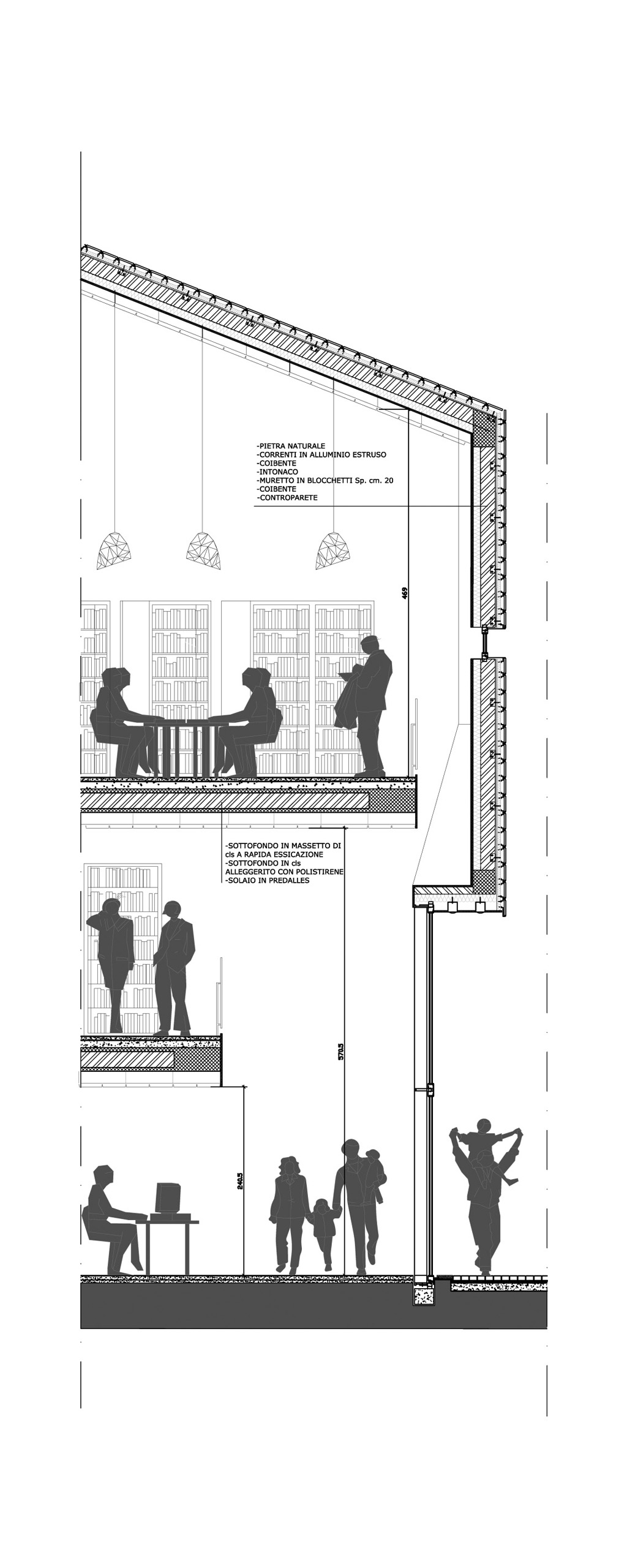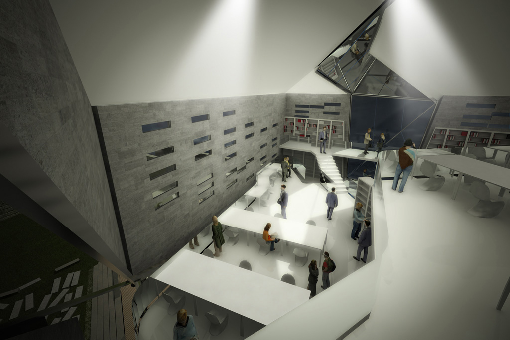 The new Library interiors are designed to create an ambient which could be the most open and united. To achieve this purpose cuts are created on the floors so to generate double hight spaces, so to remember the slopes lines. In this way the generation lines of the roof are the guide to design the interiors spaces. The first floor has a double hight in the area close to the entrance from the garden, joining as a filter zone the interior with the exterior. On the south wall there are three mezzanine to connect the first floor of the narrative to the next two levels of the essay-writings. It is a wall that works as a big library visible from all the levels and at the same time it is possible to see the people walking inside from outside. So empty spaces generated by the cuts of the floors and lines of the roof connect the different areas of the library.