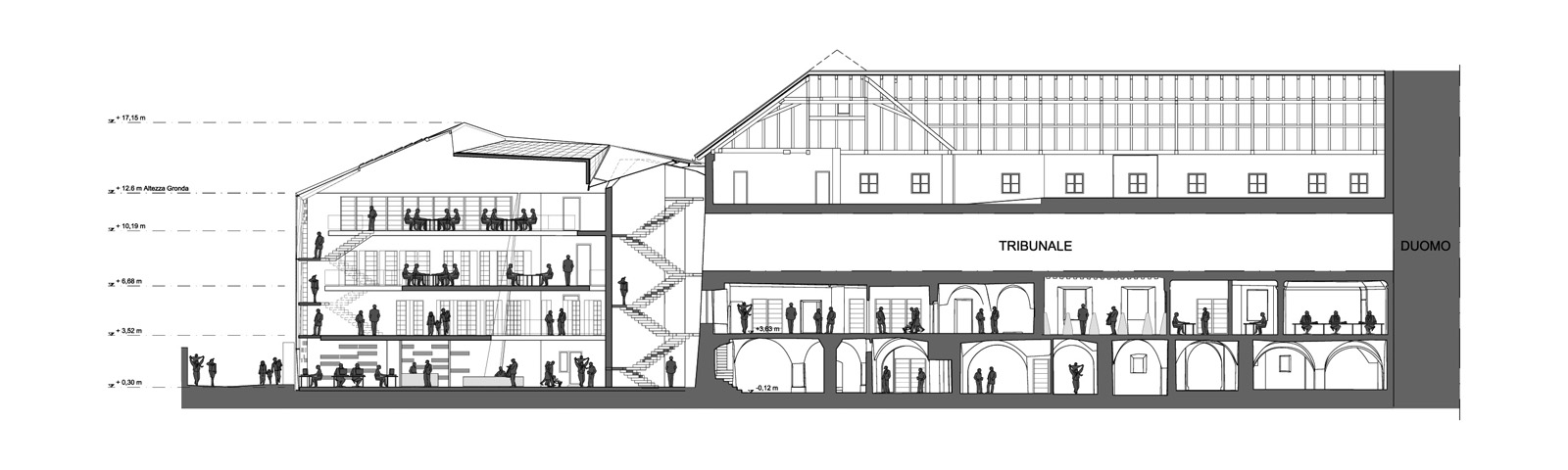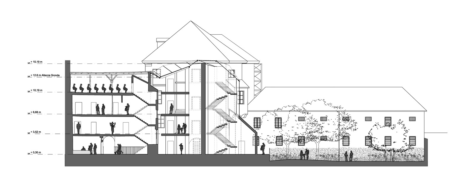 The new Building is attached to the existing buildings with a glass volume within the escape stair. The transparent hinge volume for a continuity solution goes from the façade to the roof and to the neighbours existing façades. In this way the individuality of buildings is granted, but at the same time they are in relation between each other, emphasizing the distance between past and present, coherently with the introduced assumptions.
