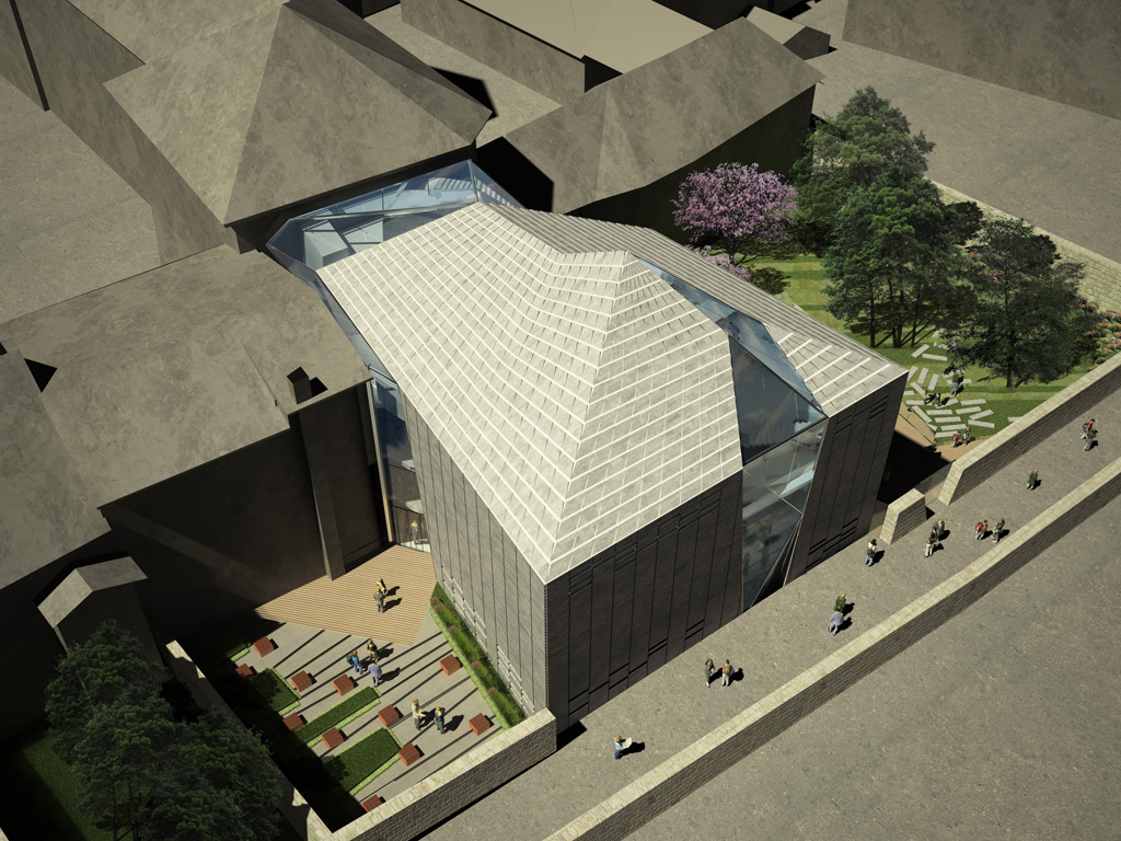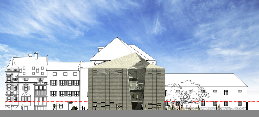 The new volume geometry and its roof slopes for a well-balanced insertion in the city context.