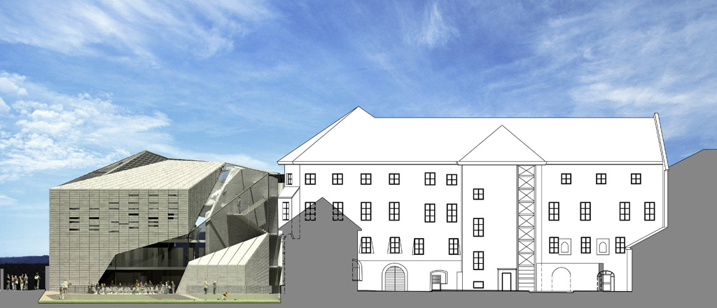 A new volume is added to respect totally the existing context, leaving at the same time a trace of the contemporary attitude of the new building. A chronological right approach is used, remanding that the site is not the consequence of just one development phases but the result of all the reconstruction projects happened in long times. So the proposal for the new building combines the traditional roofs of Bressanone with new contemporary architectonic lines, to leave a sign of the temporary collocation of the project. The Inspiration is substantially a sculptural presence cut by the natural light of Alps. Light and matter became very important for the development of the volume and its spaces. Glass windows are the flow that wraps the new building, curving it as a river between rocks. A hinge of sculptural light that separator existing building from the new library.